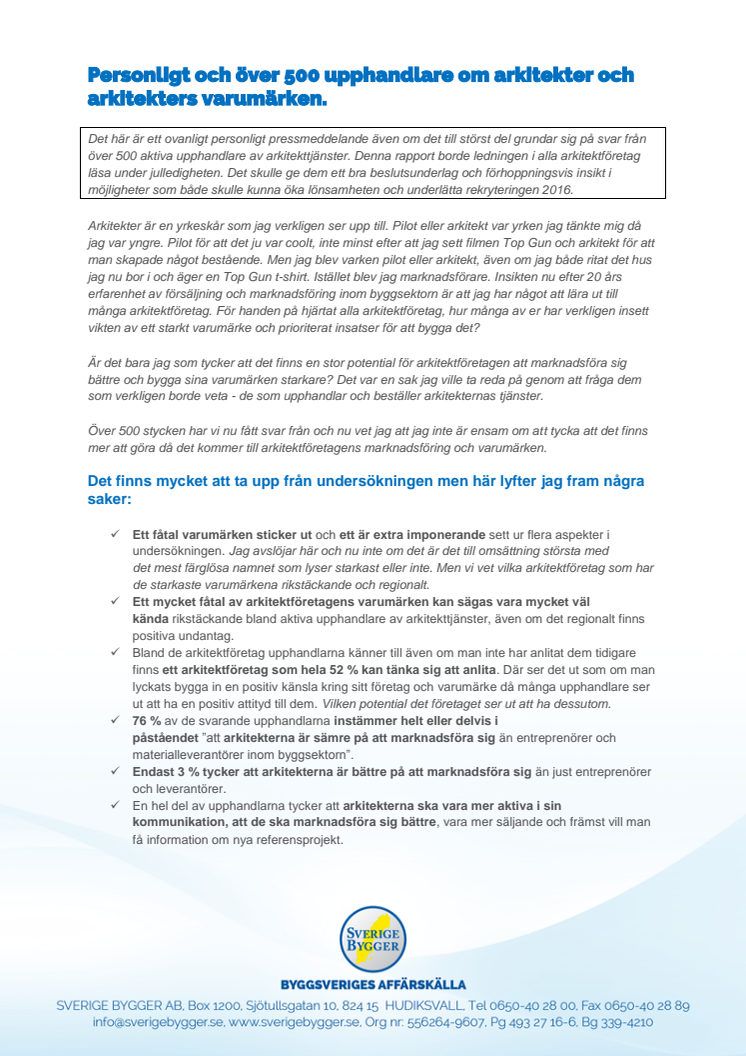 Det här är ett ovanligt personligt pressmeddelande även om det till störst del grundar sig på svar från över 500 aktiva upphandlare av arkitekttjänster. Denna rapport borde ledningen i alla arkitektföretag läsa under julledigheten. Det skulle ge dem ett bra beslutsunderlag och förhoppningsvis insikt i möjligheter som både skulle kunna öka lönsamheten och underlätta rekryteringen 2016.