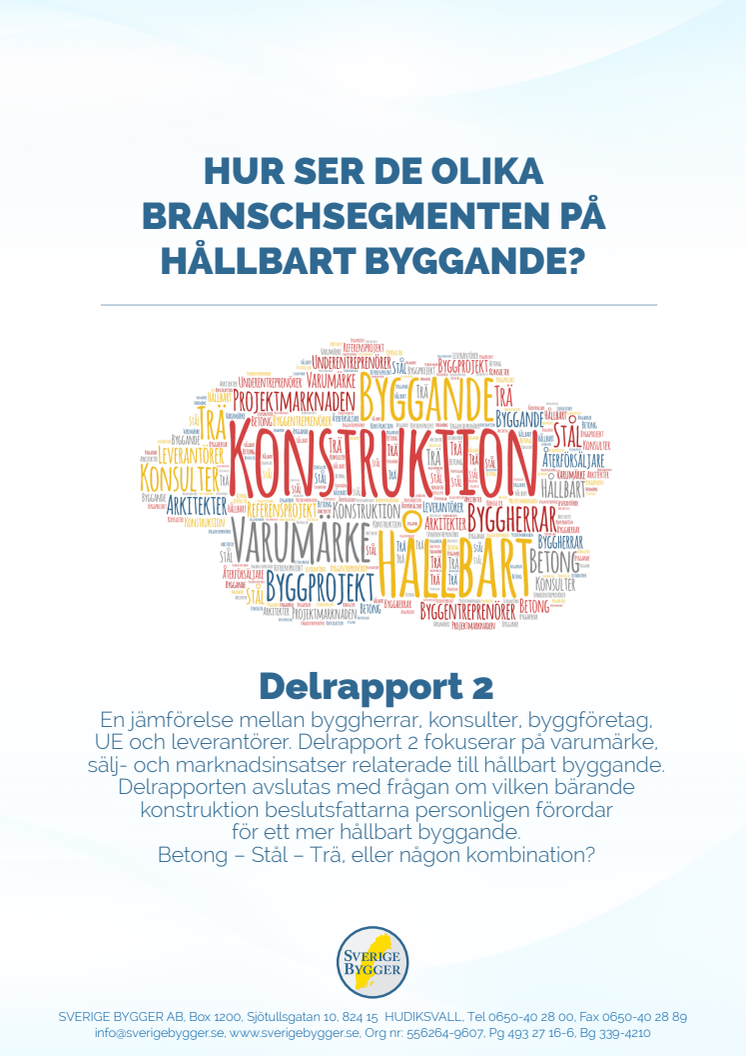 Delrapport 2 fokuserar på varumärke, sälj- och marknadsinsatser relaterade till hållbart byggande samt avslutas med frågan om vilken bärande konstruktion beslutsfattarna personligen förordar för ett mer hållbart byggande.