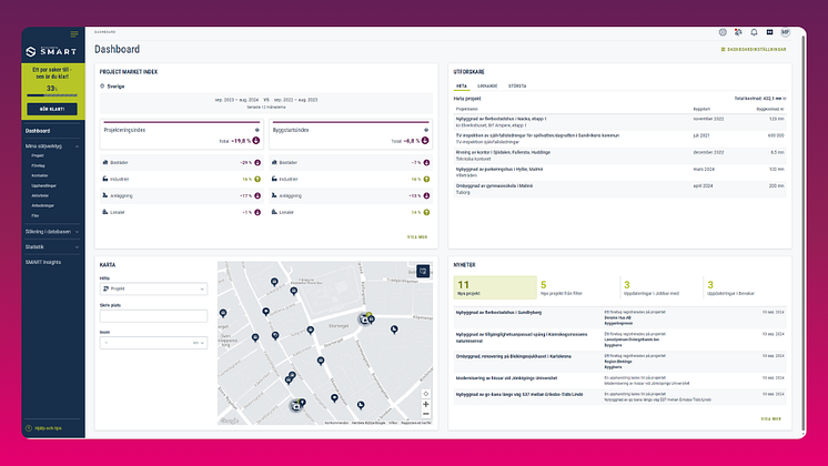 Med en helt ny dashboard, förbättrade funktioner och den unika tjänsten Project Market Index blir det nu ännu enklare för användarna av Byggfaktas bevakningstjänst SMART att få en överskådlig bild av utvecklingen på projektmarknaden – och hitta nya affärsmöjligheter.