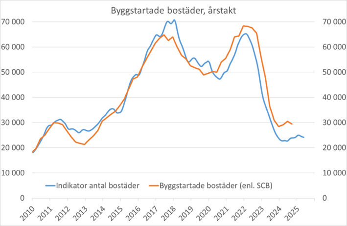 -Indikatorn har under ett par år signalerat att byggstarterna är färre än vad den officiella statistiken visar. I nuläget signalerar den en årstakt för antalet byggstartade bostäder på strax under 25 000 för 2024. En årstakt som väntas hålla i sig en bit in i 2025 också, säger Tor Borg.