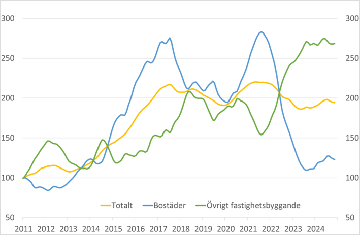 Byggstartsindikatorer, Totalt, bostäder och övrigt fastighetsbyggande (jan 2011=100)