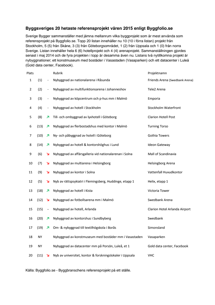 Sverige Bygger sammanställer med jämna mellanrum vilka byggprojekt som är mest använda som referensprojekt på Byggfolio.se. Topp 20 listan innehåller nu 10 (10 i förra listan) projekt från Stockholm, 5 (5) från Skåne, 3 (3) från Göteborgsområdet, 1 (2) från Uppsala och 1 (0) från norra Sverige. Listan innehåller hela 6 (6) hotellprojekt och 4 (4) arenaprojekt.