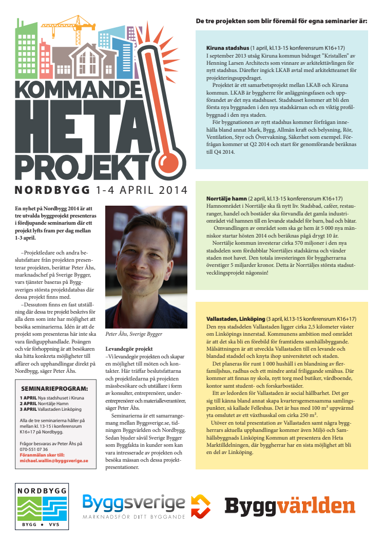 En nyhet på Nordbygg 2014 är att tre utvalda byggprojekt presenteras i fördjupande seminarium där ett projekt lyfts fram per dag mellan 1-3 april. ”Projektledare och andra beslutsfattare från projekten presenterar projekten”, berättar Peter Åhs, marknadschef på Sverige Bygger, vars tjänster baseras på Byggsveriges största projektdatabas där dessa projekt finns med.