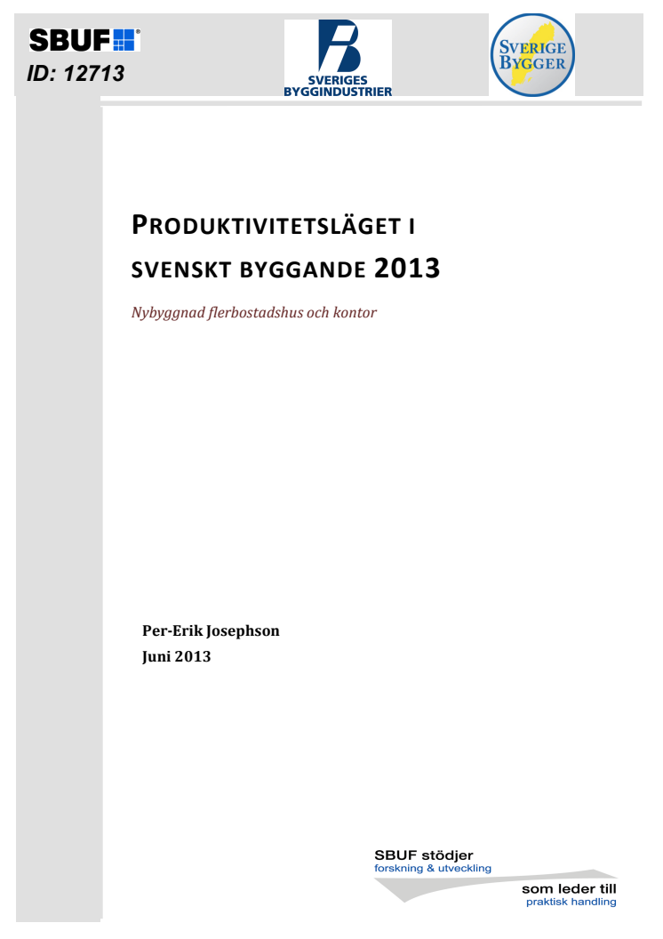 Rapporten redovisar produktivitetsrelaterade data för nybyggda flerbostadshus och kontor, färdigställda under 2012 och inledningen av 2013. Den syftar till att med hjälp av fakta stimulera och vägleda förbättringsinsatser hos beställare, konsulter, entreprenörer och andra aktörer som har betydelsefull inverkan på att byggprocessen bedrivs på ett effektivare och säkrare sätt. Undersökningen påvisar stora skillnader mellan väl fungerande och mindre väl fungerande byggprojekt.
