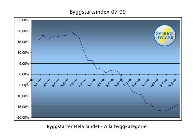 Sverige Byggers historiska byggstartindex har sedan augusti 2007 varje månad haft en nedåtgående trend. Sett till allt byggande så visar nu det nya byggstartindexet för första gången en uppåtgående trend. Fortfarande är dock byggstartindex negativt.