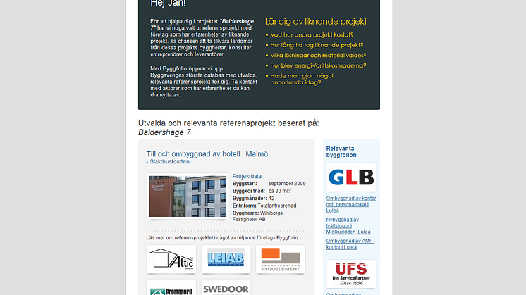 Ett helt nytt referensmail matchar referensprojekt på Byggfolio.se med nya, kommande projekt från Byggsveriges största projektdatabas.