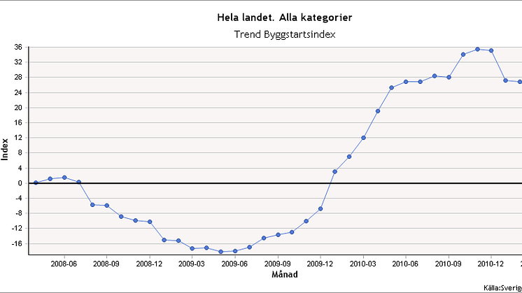 Byggstartsindex per april 2011, visar (+24%), och har därmed dämpats svagt sedan toppen i december 2010 (+35%). Belastningen av pågående byggprojekt under första halvåret 2011 är rekordstort, men vi ser ett något fallande byggstartsindex under den närmaste tiden. Dock har vi sett en ökad aktivitet i projekteringsindex varför vi är positiva till den fortsatta utvecklingen på framförallt husbyggnation. Anläggning har en fallande trend för närvarande. Det säger Mats Olov Hildingsson, ansvarig för statistik och analys hos bygginformationsföretaget SverigeBygger AB.