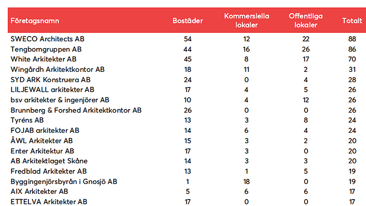 AB Arkitektlaget Skåne | 14 | 3 | 3 | 20 |