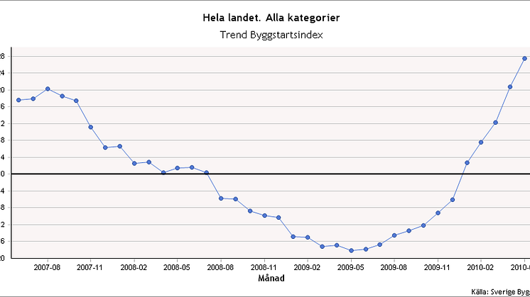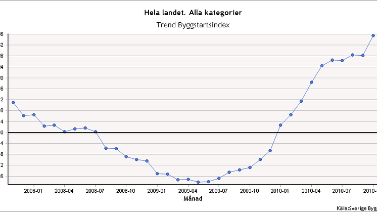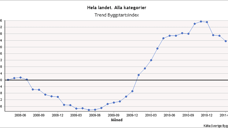 Sverige Byggers Byggstartsindex t o m januari 2012 ligger på +2 % för hela landet. Hetaste länen är Västernorrland med +37 %, Jönköping + 24 %, Värmland + 19 %. Andra län med positivt index är Västra Götaland med +7 %, Uppsala +7 %, Östergötland +6 %, Stockholm +4 %, Skåne +4 %, Västmanland +1 %. Sett till typ av byggande är det lokaler (kontor, affärslokaler, sjukvård etc.) som är hetast.
