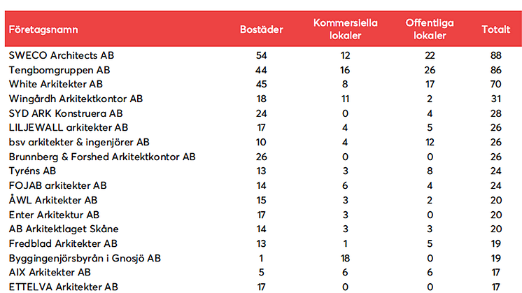 Byggfakta har ca 1500st företag som varit aktiva i ett projekt som arkitekt under de senaste två åren. Nu har vi tittat närmare på vilka som blivit utsedda i flest projekt under 2016, detta fördelat på bostäder, kommersiella och offentliga lokaler.