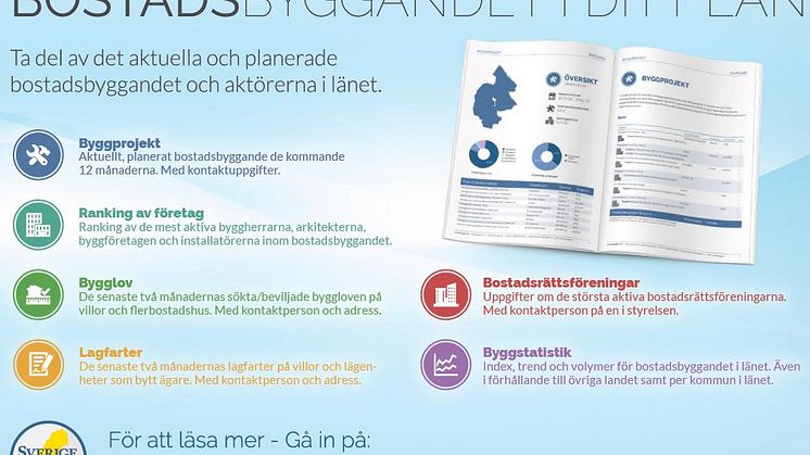 Nyhet! Färska rapporter om bostadsbyggandet per län – ranking av aktörerna, de planerade projekten, byggstatistik m.m. Bostadsbyggandet är hett! Därför har vi tagit fram färska rapporter som på länsnivå ger en omfattande kartläggning över nuläget och möjligheterna framåt. Vilka är t ex. de mest aktiva byggherrarna, arkitekterna, byggföretagen och installatörerna per län och vilka projekt planeras?