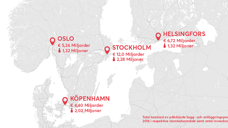 I storstadsregionerna Stockholm, Oslo, Köpenhamn och Helsingfors startade bygg- och anläggningsprojekt till en total kostnad av € 28,44 Miljarder. Det är € 4,4 Miljarder mer än under 2015.