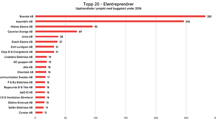 När vi ser på topplistan så står topp 20st för 37% av marknaden räknat i antal projekt med byggstart under 2016. Övriga aktörer står alltså för 63%. Topp 4 som är Bravida, Assemblin, Midroc och Caverion står tillsammans för 25% av marknaden som består av 2671st projekt där Byggfakta har kopplat en elentreprenör.