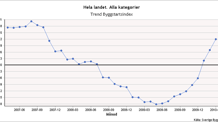 Ljusare tider i sikte, men resan går trögt under 2010. Byggstartsindex är ett rullande månadsindex, som mäter verkliga byggstarter och avvikelsen mellan innevarande 12 månaders period mot föregående 12 månaders period. Indextalet kan sen filtreras med urval av geografi, byggkategori samt byggnadsarter.
