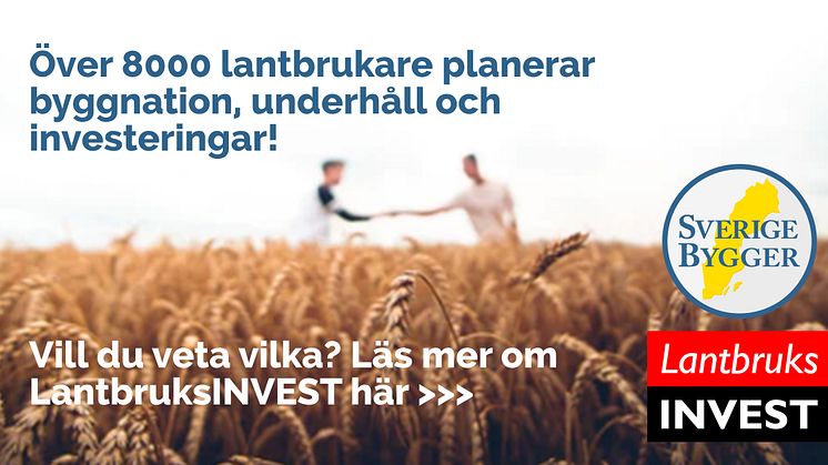 Årets stora kartläggning över lant- och skogsbrukarnas planerade investeringar är nu sammanställd. Den visar att över 8 000 av dem planerar att bygga, renovera, underhålla sina fastigheter och/eller att investera i maskiner, fordon, verktyg, utrustning m.m. Nu kan du som erbjuder varor eller tjänster till dessa lantbrukare ta del av informationen och affärsmöjligheterna.